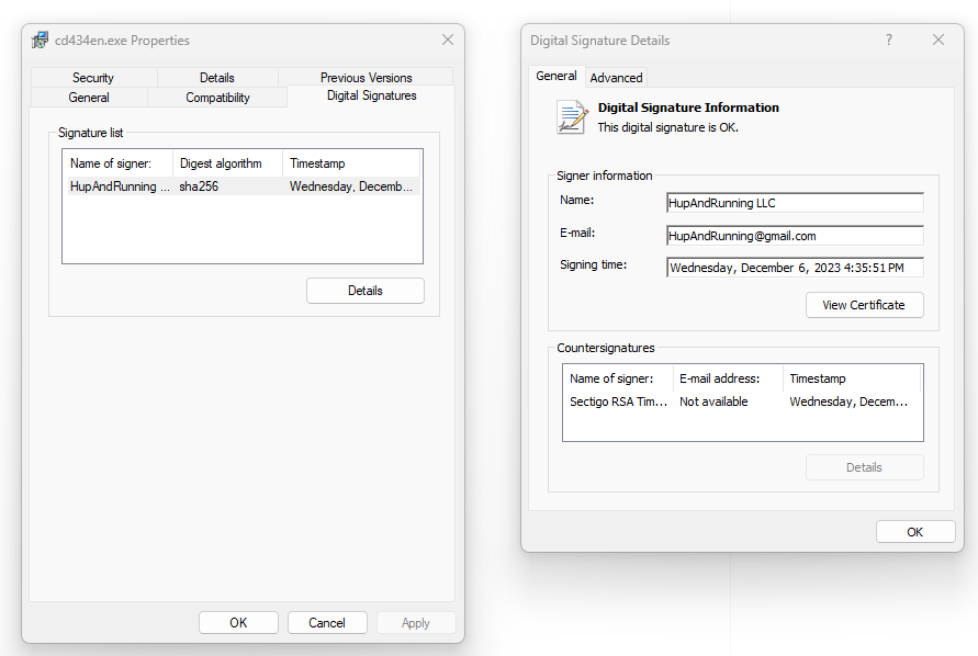 If you are unsure whether you can trust the installer executable, you can view its security certificate yourself. To do this, right‑click the installer (e.g., cd434en.exe), select Properties, and then open the Digital Signatures tab. A secure copy of the installer will show the correct publisher information and should look like this: